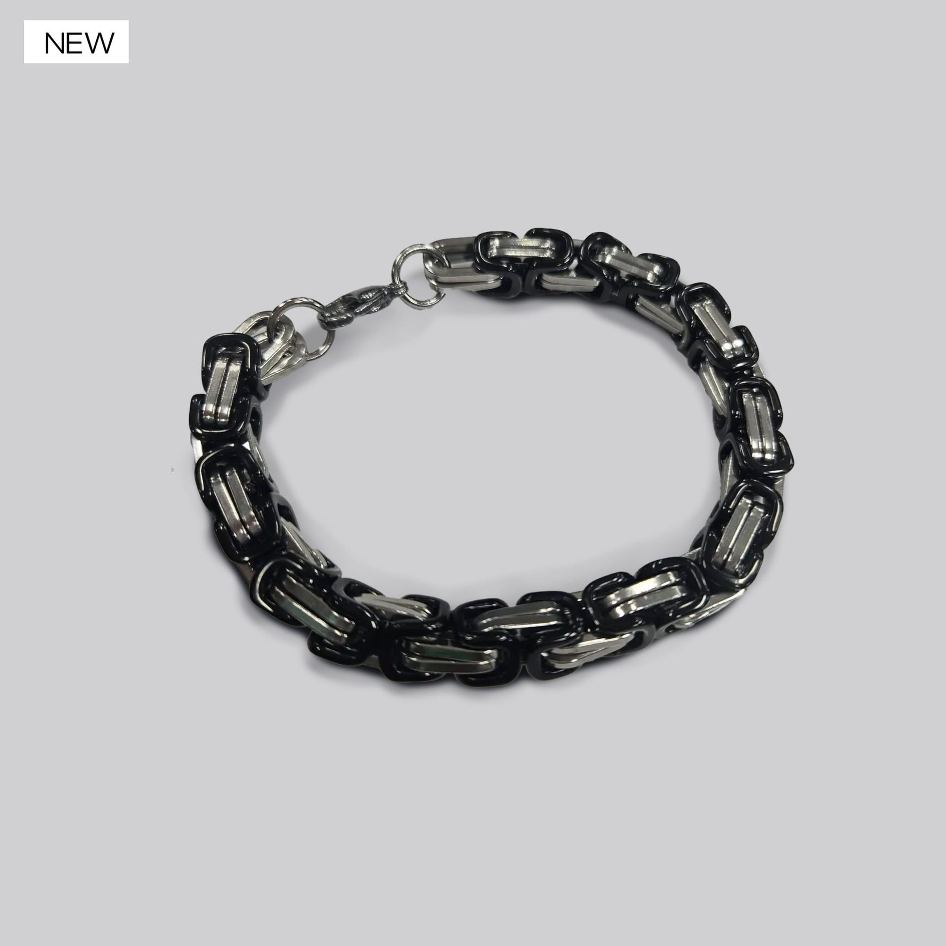Imponente y con carácter, este brazalete de eslabones gruesos bicolor combina el brillo del acero inoxidable con detalles en tono negro, creando un contraste audaz y moderno. Su diseño tipo “cadena de moto” refleja fuerza, estilo industrial y una estética masculina contemporánea.