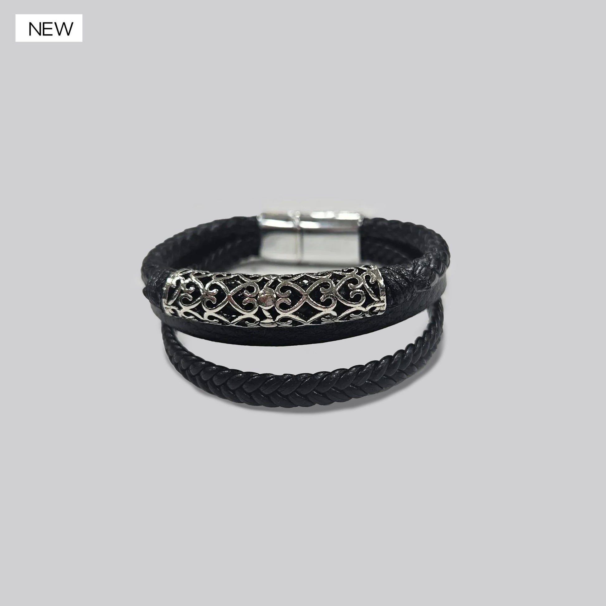 Destaca con estilo con este elegante brazalete masculino de doble tira en cuero negro. Su diseño combina una cuerda trenzada y una banda lisa que se unen con un detalle central en metal calado, de acabado plateado, que le da un toque sofisticado y artístico.