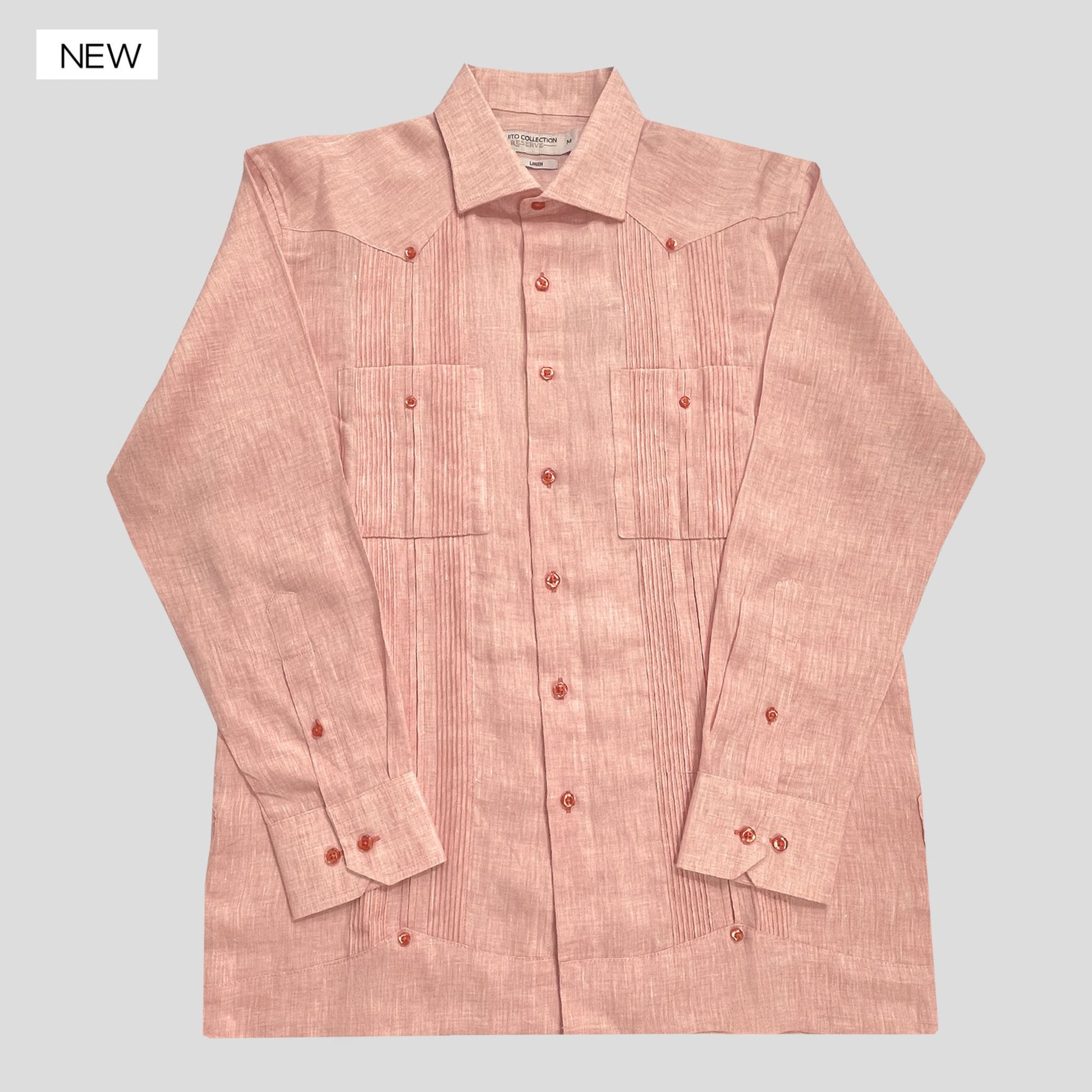Elegante y fresca guayabera confeccionada en lino ligero, ideal para climas cálidos y ocasiones formales o casuales. Su diseño clásico incluye alforzas verticales, cuatro bolsillos funcionales al frente y botones detallados al tono, que realzan su estilo auténtico. El color salmón aporta un toque moderno y sofisticado, perfecto para destacar con distinción.