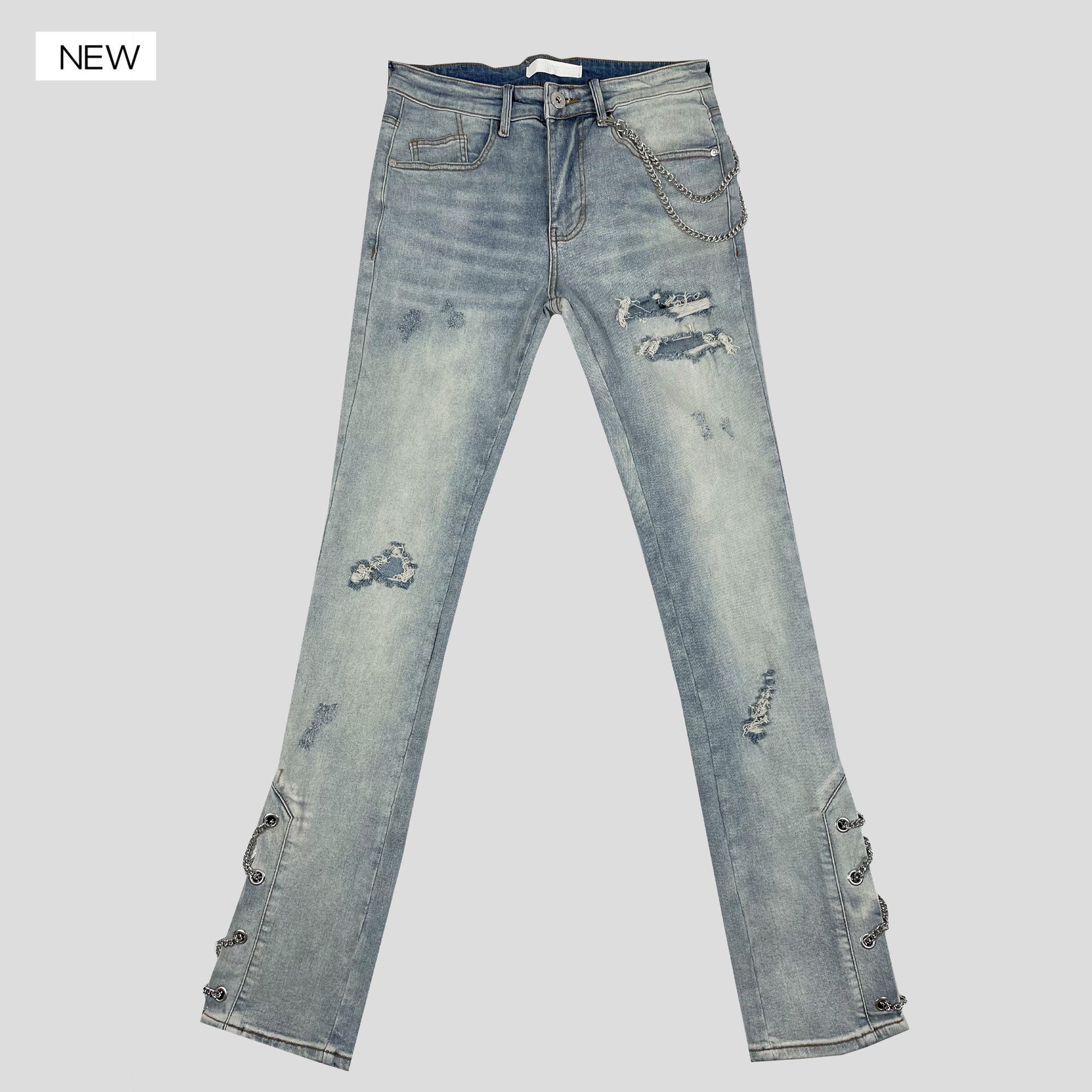 KDNK Jean con Cadenas – Stacked Fit combina estilo moderno con un toque rebelde. Su denim light blue wash aporta un look fresco y versátil, mientras que los detalles RASGADOS le dan personalidad.