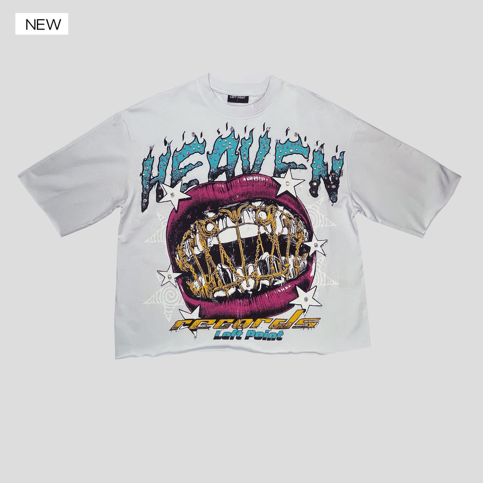 Este crop top Left Point, confeccionado en suave algodón, destaca por su diseño gráfico vibrante con aplicación de rhinestones en el frente, logrando un look llamativo y urbano que combina brillo, estilo y comodidad para outfits modernos con actitud.