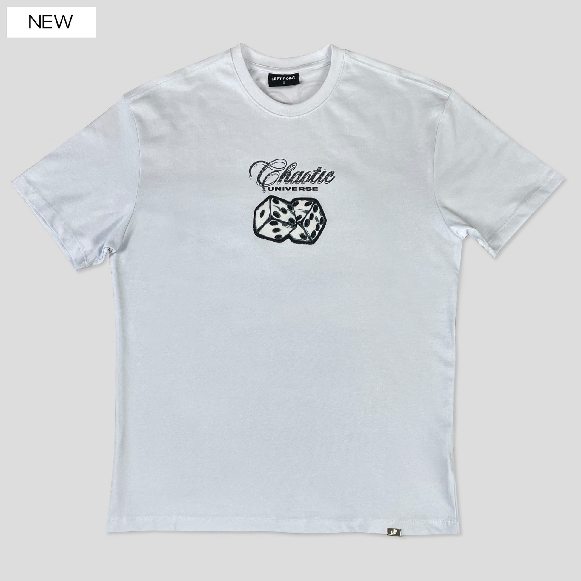 Atrévete a destacar con esta camiseta Left Point, una pieza que combina estilo gráfico audaz con una vibra urbana moderna. Al frente, un diseño pequeño de dados con el texto “Chaotic Universe” marca el tono, mientras que en la parte trasera se roba la atención con una versión ampliada del arte acompañada de elementos gráficos conceptuales.