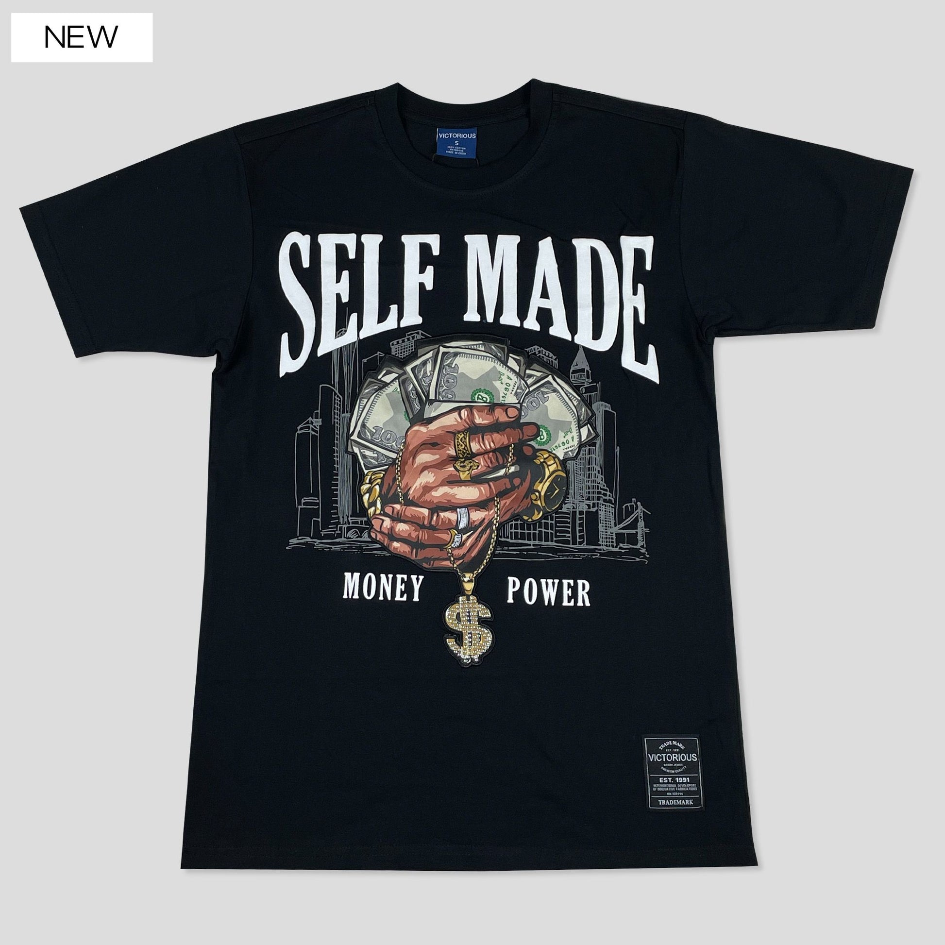 Lleva tu actitud al frente con esta camisa Self Made de Victorious. Su diseño gráfico muestra una poderosa ilustración de una mano con fajos de dinero, joyas y la frase "Money Power", resaltando un espíritu de éxito y ambición. Confeccionada en 100% algodón, brinda máxima comodidad y un estilo audaz perfecto para destacar en cualquier lugar.